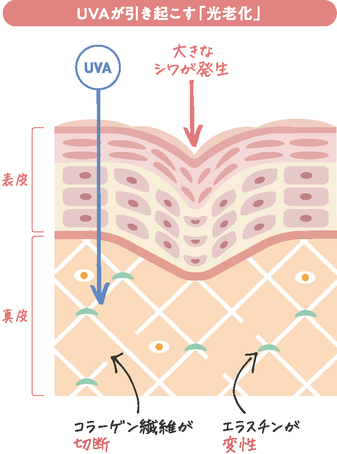 一方で光老化は、以前は「自然老化を加速させるもの」と考えられていましたが、最近では自然老化とは全く異なるしくみで肌の変化をもたらす現象と理解されています。光老化では、紫外線の影響で肌を支える柱となるコラーゲンが破壊され、しなやかさを生み出すエラスチンが変性してしまいます。